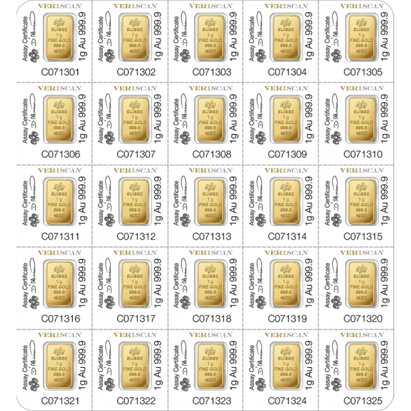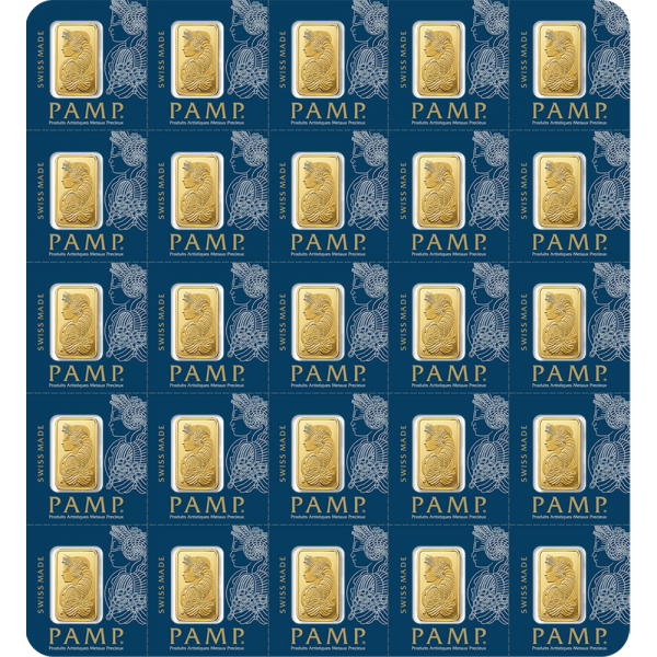 These 25g gold bars from PAMP Suisse are a great combination of recognized, high-quality bullion, and unparalleled flexibility in distribution and selling. Individually sealed with respective assay certificate, each Multigram Bar is easily divisible into single 1g units, granting investors flexibility in liquidation and distribution. These products are manufactured to the industry-leading standards of PAMP Suisse, with precision machining and secure, tamper-proof packaging.
